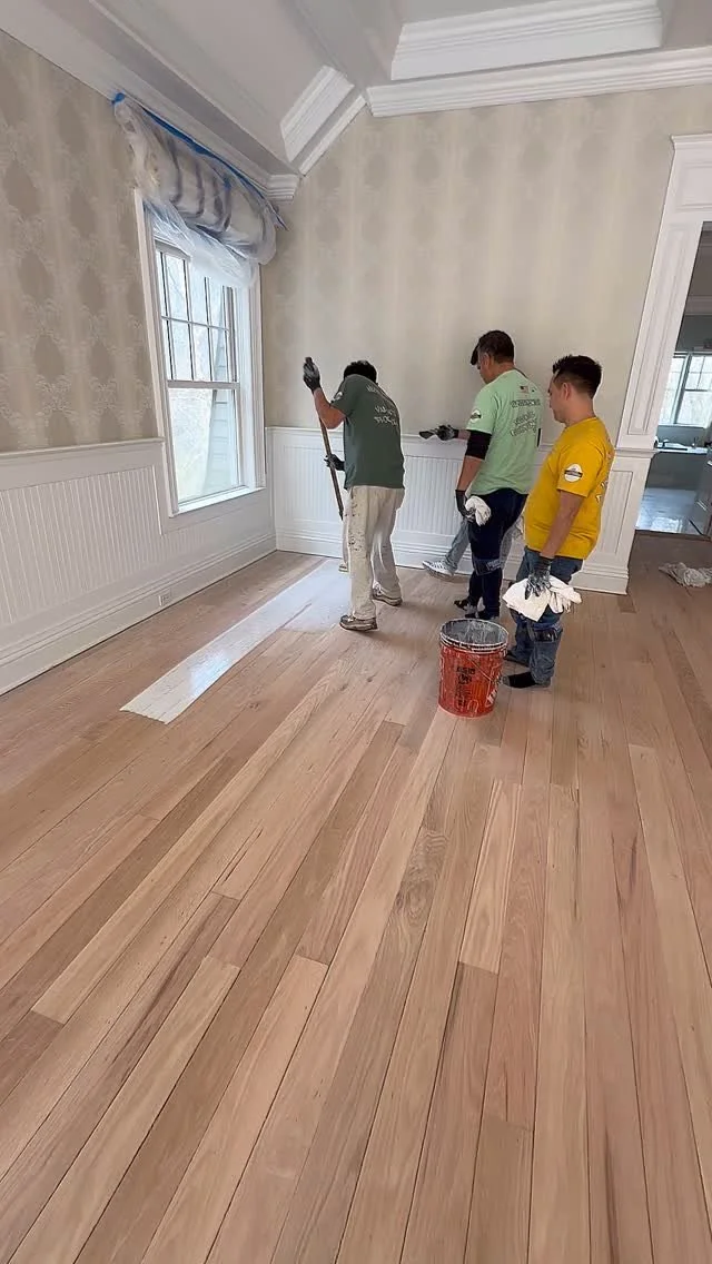 7" Engineered Select Rift & Quarter Sawn White Oak & 3" X 21" Select Rift & Quarter Sawn White Oak Chevron flooring all Installed over radiant heating, sanded & finished with 1 coat custom off-white stain blend and 3 coats Bona Traffic HD Extra Matte polyurethane.